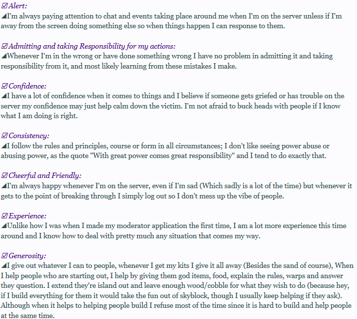 The Reasons People Want To Be A Mod Essay Example 832 Words Gradesfixer from gradesfixer.com This is a detailed tutorial on how to make a mod application. I've been staff on many other servers, currently mod on a server with over 800 members. Aug 23, 2019 · yes, i do! Jul 20, 2012 · how to make a decent staff member app for a minecraft server. I want to exclude or ignore it, however all i see in a cfg file is an option ignore deleting already synced mods. Keep in mind that each servers criteria isn't always the same, so make sure you don't just copy this format. Also i've been moderating on some other servers (my minecraft discord server, friend's discord with 700+ members) those servers are sadly dead now r.i.p